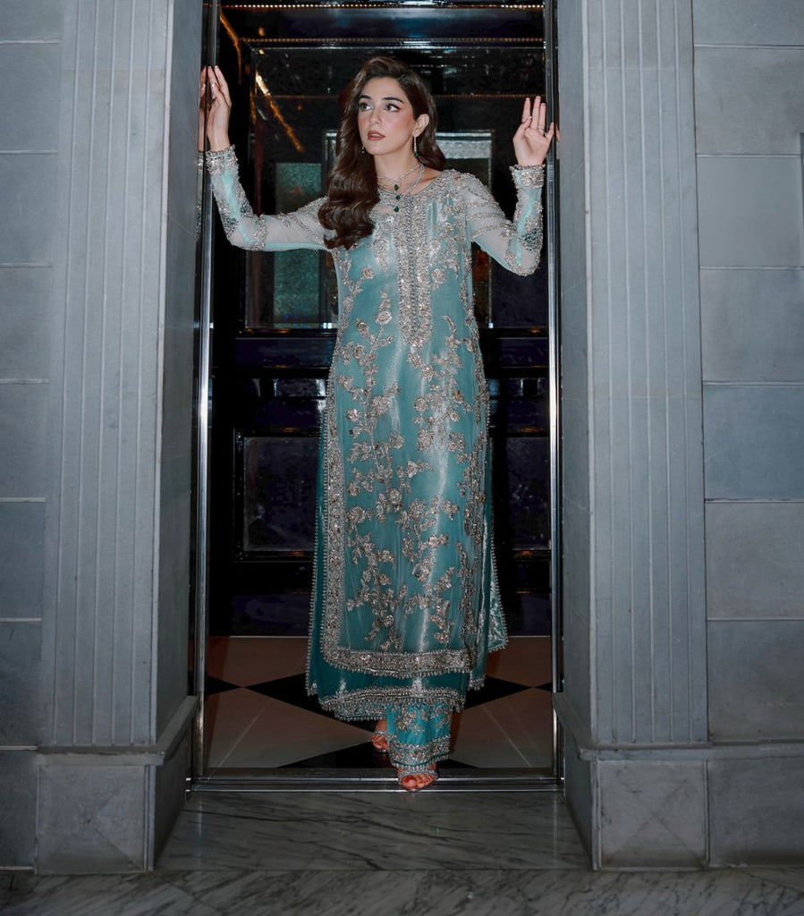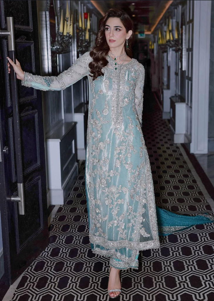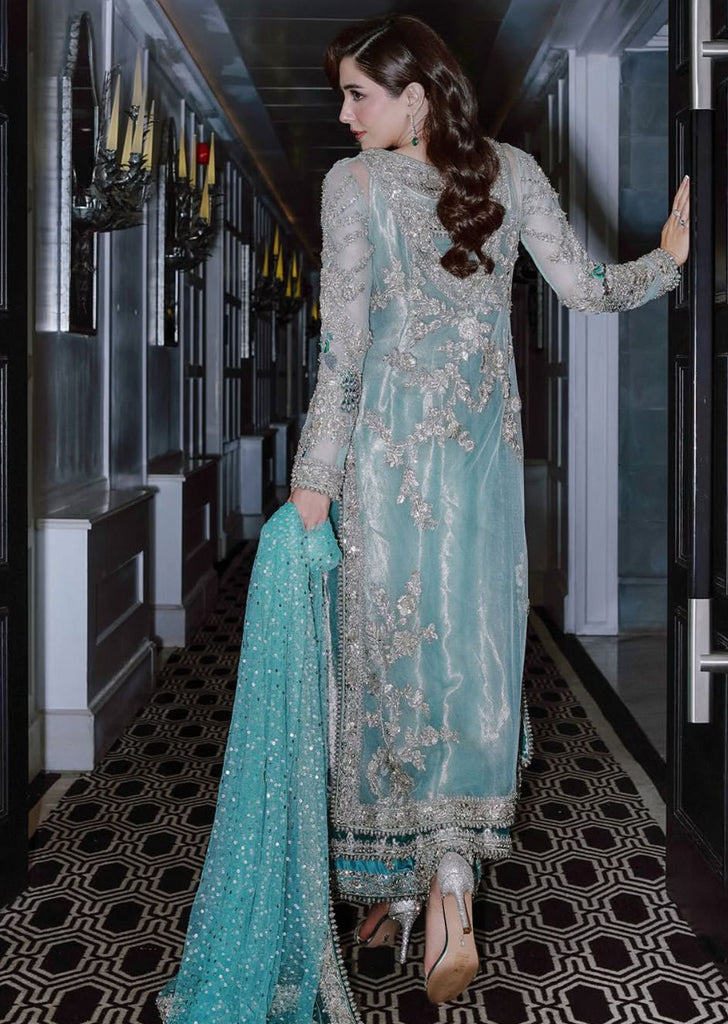 "FEROZEAH" is a elegant long shirt, designed in a serene aqua tone,ornamented with intricate silver embellishments. The hand embellished patterns, ..