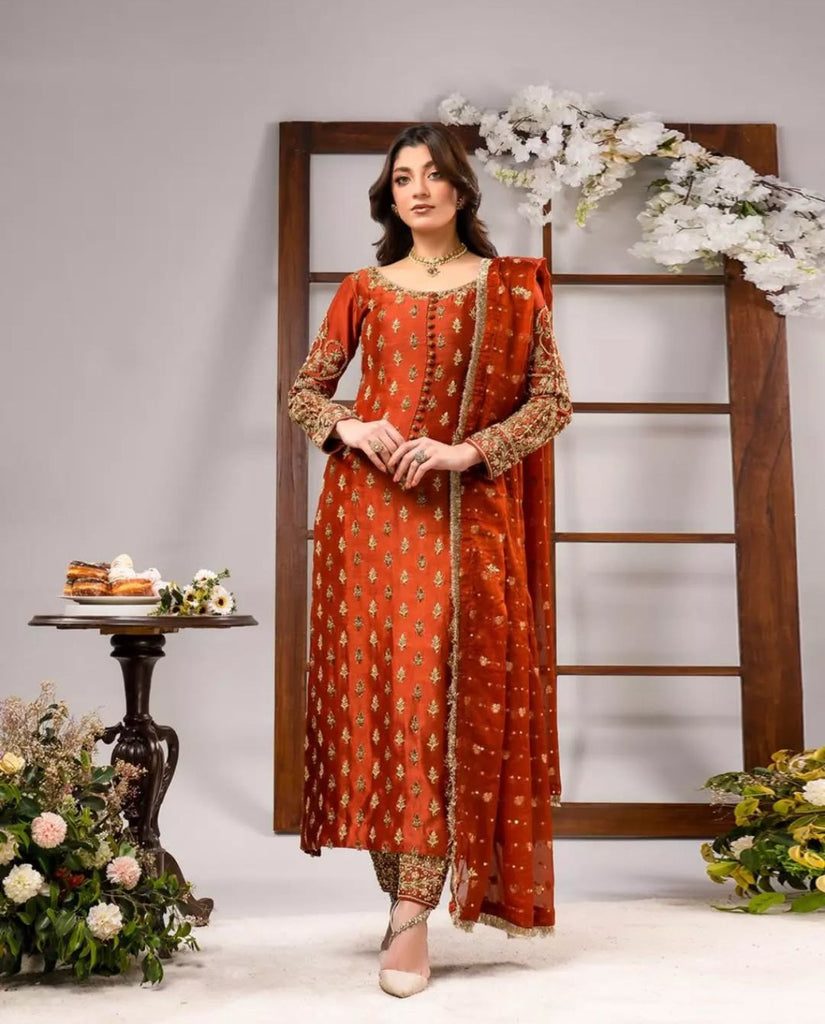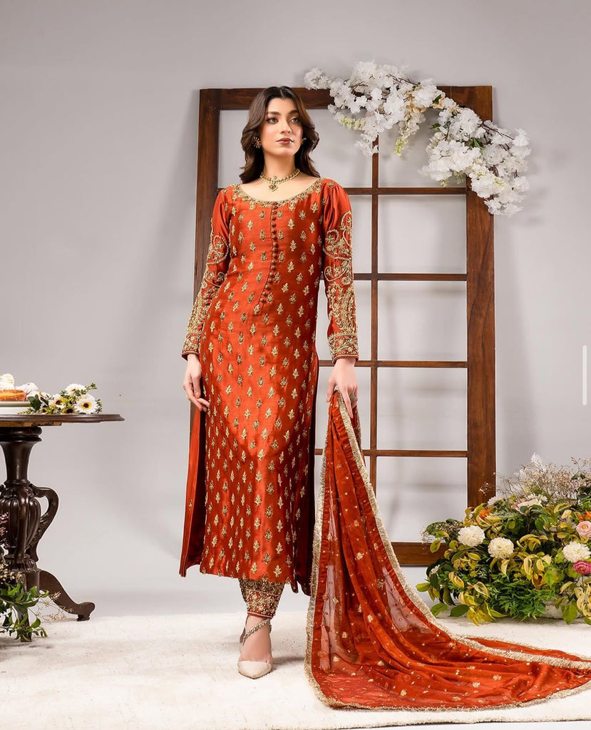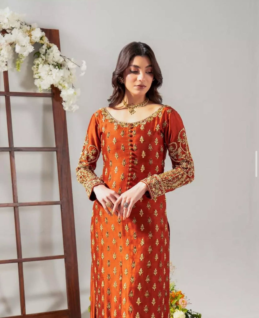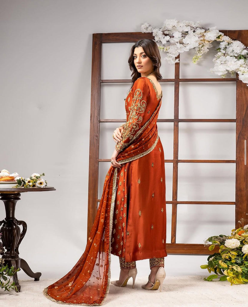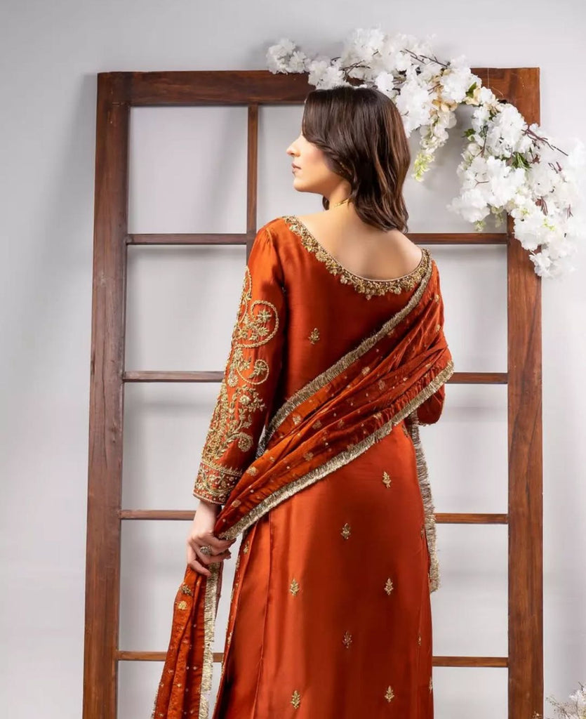 Ahmad Sultan TANGERINE Luxury Wedding Formal Raw Silk Hand Embellished 3 Piece Dress
